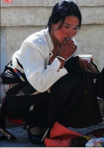 སློང་མོའི་ཚུལ་གྱིས་ཇ་དཀར་དེ་བཟུང་བཞིན།